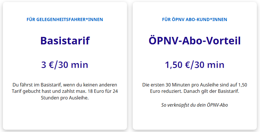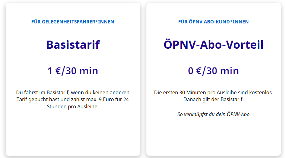 - Klassisches Fahrrad: je Ausleihe eines klassischen Fahrrads sind die ersten 30 Minuten kostenlos, danach gilt der Basistarif.